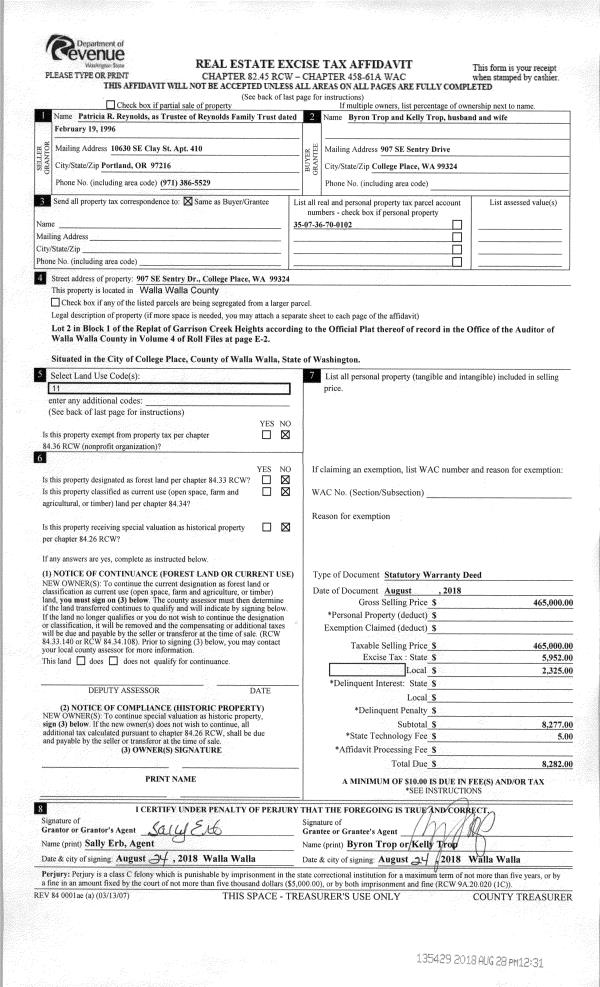 | 3 | 08/28/2018 | SWD | STATUTORY WARRANTY DEED | REYNOLDS PATRICIA AS TRUSTEE | TROP BYRON & KELLY | | | $465,000.00 | 135429 | 2018-07133 |