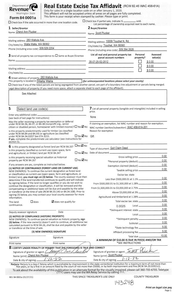 | 1 | 01/13/2022 | QCD | QUIT CLAIM DEED | PLUCKER CHERYL ANN LIFE ESTATE | PLUCKER SCOTT | | | $0.00 | 143248 | 2022-00456 |
