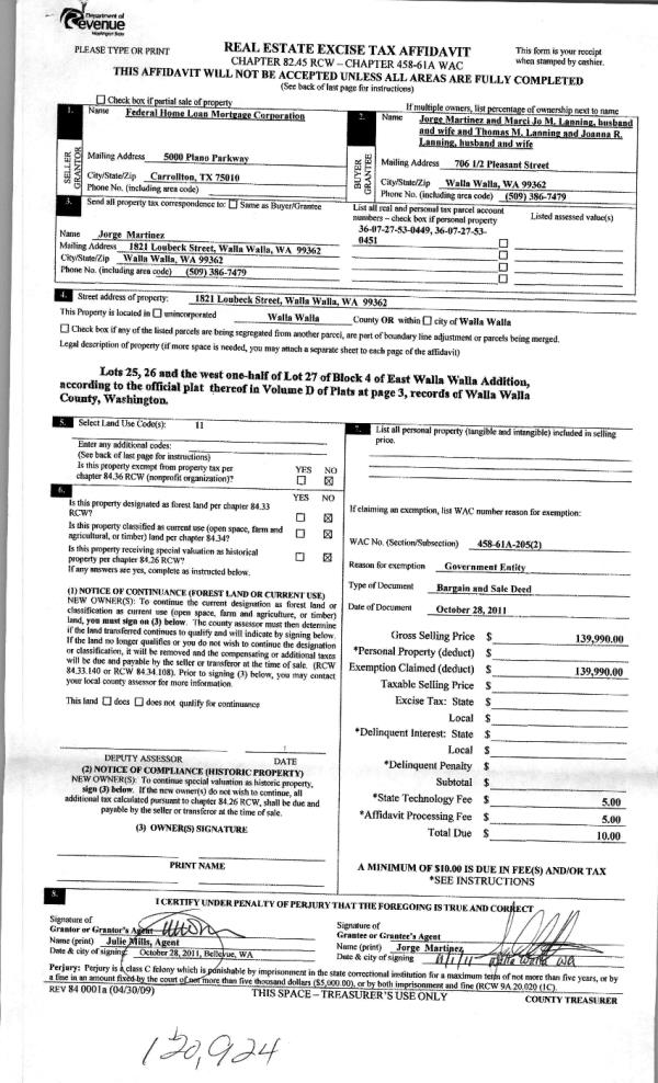 | 5 | 11/04/2011 | WARRANTY D | WARRANTY DEED | FEDERAL HOME LOAN MORTGAGE CORP | MARTINEZ JORGE & MARCI JO M LANNING | | | $139,990.00 | 120924 | 2011-08636 |