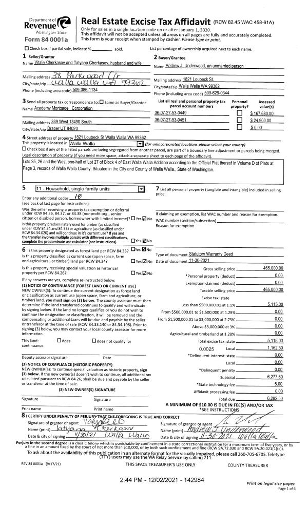 | 1 | 11/30/2021 | SWD | STATUTORY WARRANTY DEED | CHERKASOV VITALIY & TATYANA | UNDERWOOD ANDREW J | | 2-PARCELS | $465,000.00 | 142984 | 2021-14241 |