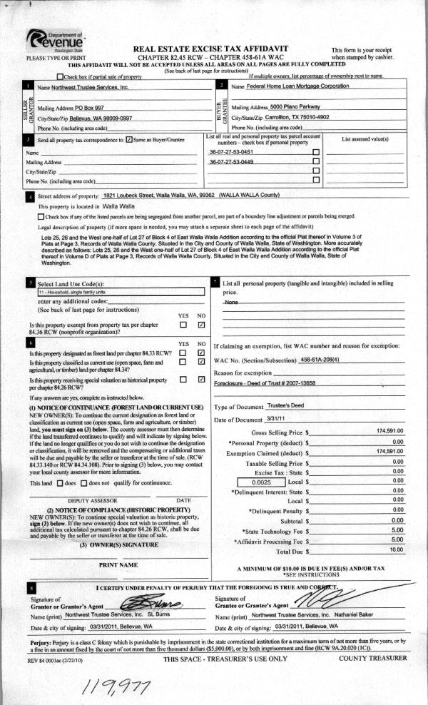 | 6 | 04/05/2011 | WARRANTY D | WARRANTY DEED | NORTHWEST TRUSTEE SERVICES INC | FEDERAL HOME LOAN MORTGAGE COR | | | $174,591.00 | 119977 | 2011-02868 |