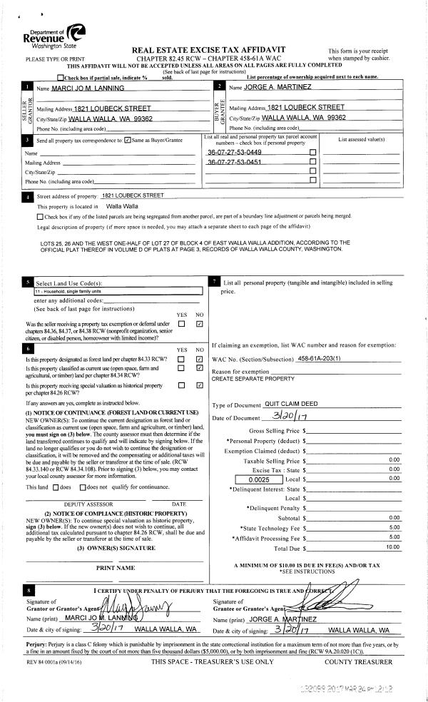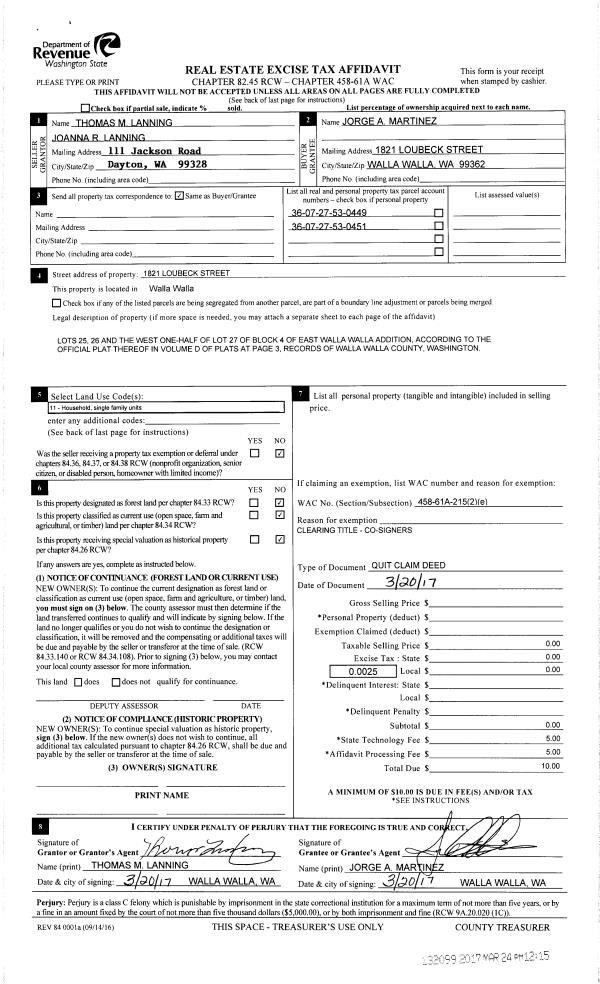 | 3 | 03/20/2017 | QCD | QUIT CLAIM DEED | LANNING THOMAS M & JOANNA R | MARTINEZ JORGE A | | | $0.00 | 132098 | 2017-02266 |