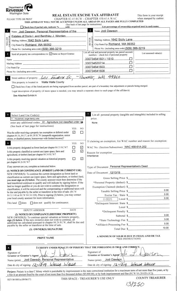 | 2 | 12/13/2019 | DPR | DEED OF PERSONAL REPRESENTATIVE | WORDEN BENTHLEY J & DORIS I | DAWSON JODI | | | $0.00 | 138250 | 2019-10365 |