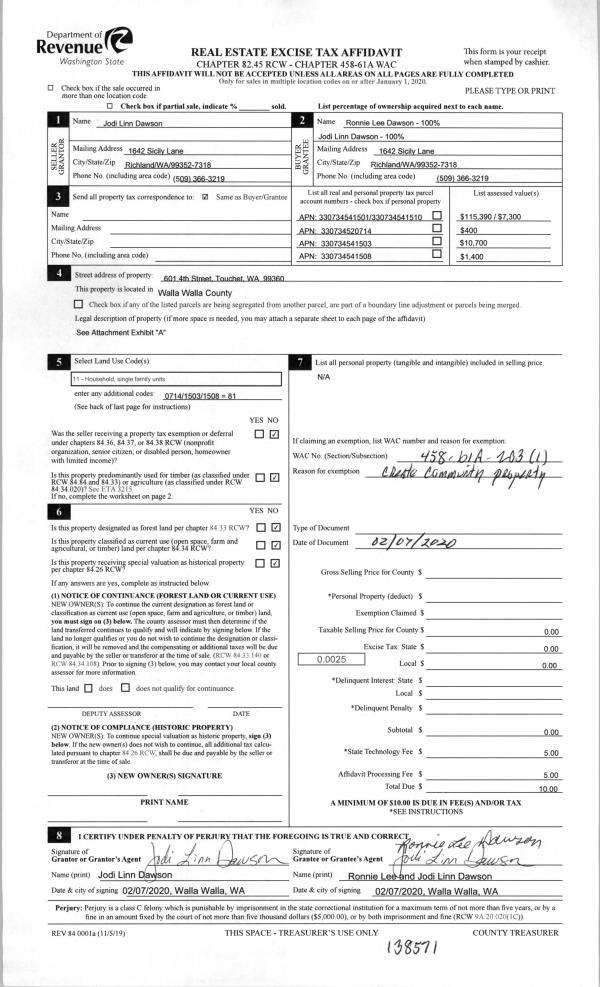 | 1 | 02/07/2020 | QCD | QUIT CLAIM DEED | DAWSON JODI | DAWSON RONNIE L & JODI L | | | $0.00 | 138571 | 2020-01144 |