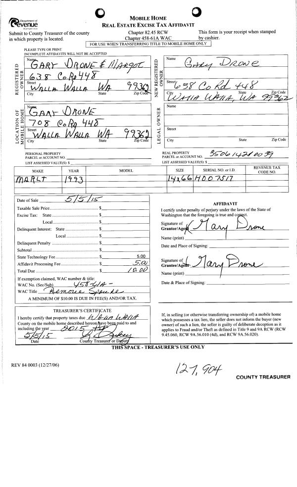 | 2 | 05/05/2015 | MH AFFIDAV | MOBILE HOME AFFIDAVIT | DRONE GARY C & MARGOT L | DRONE GARY C | | | | 127904 | MHAFF-127904 |