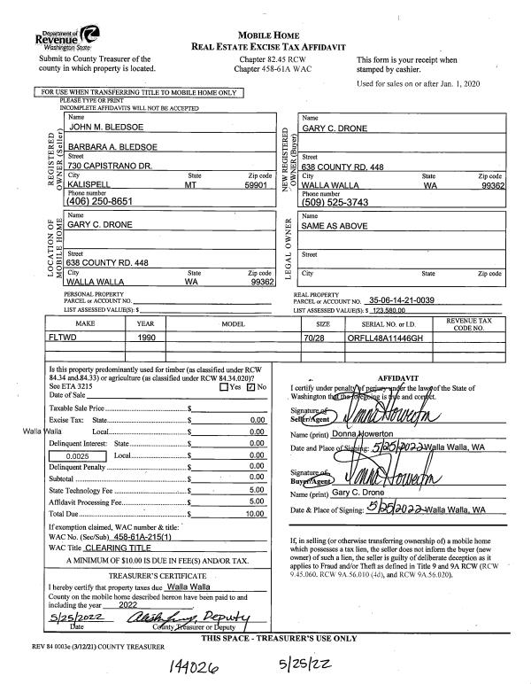 | 1 | 05/25/2022 | MH AFFIDAV | MOBILE HOME AFFIDAVIT | BLEDSOE JOHN M & BARBARA A | DRONE GARY C | | | | 144026 | MHAFF-144026 |