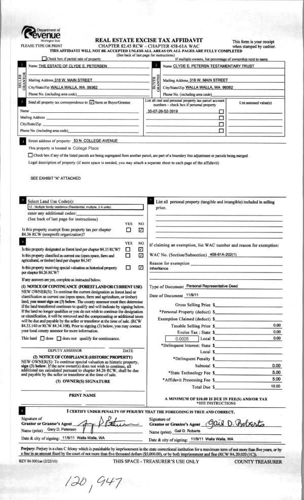 | 1 | 11/09/2011 | WARRANTY D | WARRANTY DEED | PETERSEN, CLYDE ESTATE OF | PETERSEN, CLYDE E TESTAMENTARY | | | | 120947 | 2011-08811 |