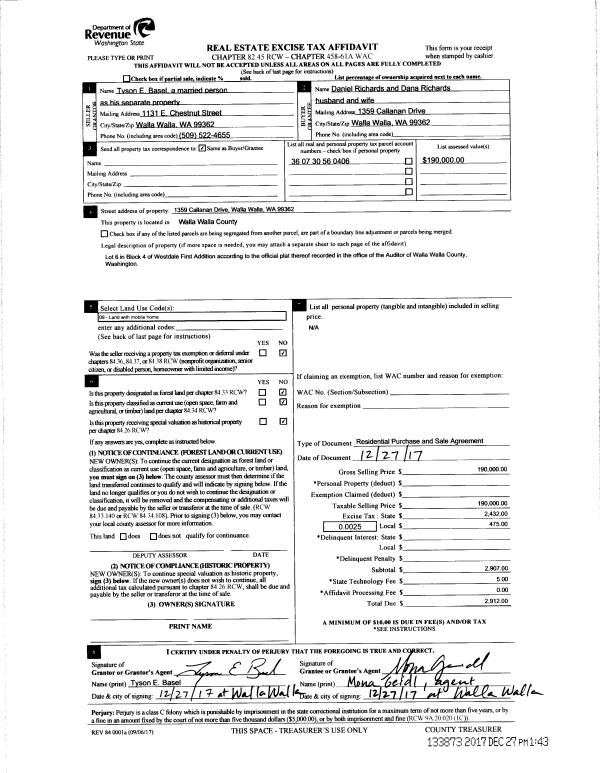 | 1 | 12/27/2017 | SWD | STATUTORY WARRANTY DEED | BASEL TYSON E | RICHARDS DANIEL & DANA | | | $190,000.00 | 133873 | 2017-10432 |