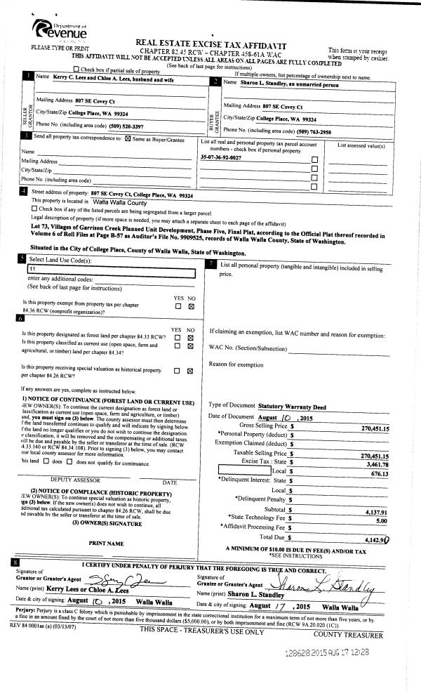 | 1 | 08/17/2015 | SWD | STATUTORY WARRANTY DEED | LEES KERRY C & CHLOE A | STANDLEY SHARON L | | | $270,451.00 | 128628 | 2015-07167 |