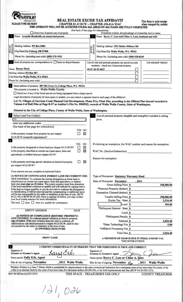 | 2 | 11/18/2011 | WARRANTY D | WARRANTY DEED | REMBOLDT, AVONELLE | LEES, KERRY C & CHLOE A | | | $198,000.00 | 121026 | 2011-09120 |