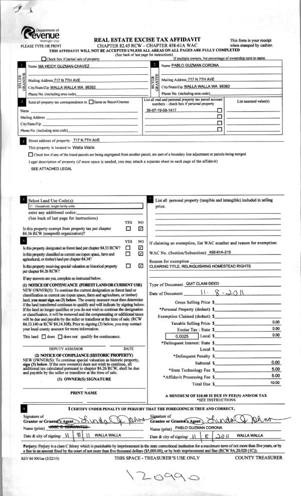 | 2 | 11/15/2011 | QCD | QUIT CLAIM DEED | MA HEIDY GUZMAN-CHAVEZ | CORONA, PABLO GUZMAN | | | $0.00 | 120990 | 2011-08986 |