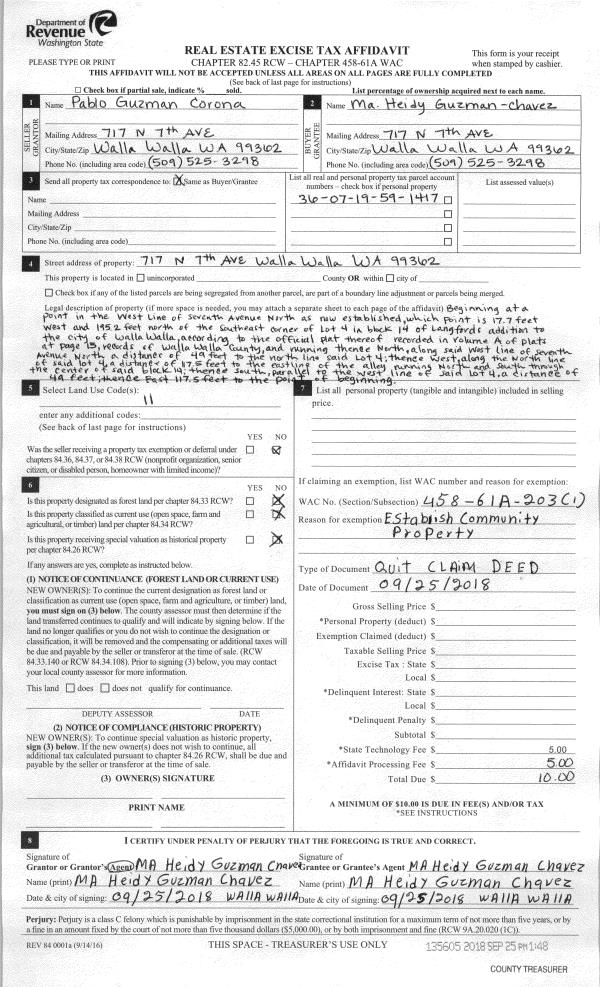 | 1 | 09/25/2018 | QCD | QUIT CLAIM DEED | CORONA PABLO GUZMAN | GUZMAN-CHAVEZ MA HEIDY | | | $0.00 | 135605 | 2018-07988 |