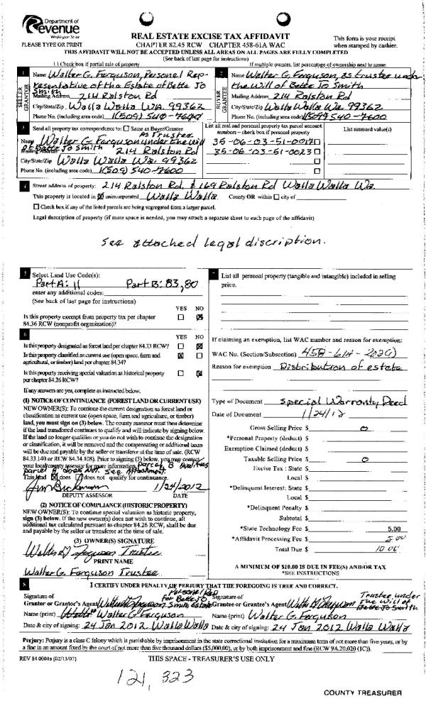 | 1 | 01/24/2012 | WARRANTY D | WARRANTY DEED | SMITH, BETTE JO ESTATE OF | SMITH, BETTE JO TRUST | | | | 121323 | 2012-00688 |