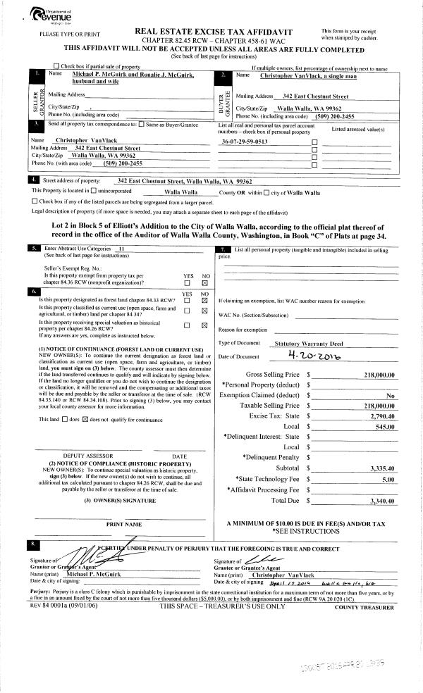 | 1 | 04/20/2016 | SWD | STATUTORY WARRANTY DEED | MC GUIRK MICHAEL P & RONALIE J | VANVLACK CHRISTOPHER | | | $218,000.00 | 130057 | 2016-02886 |