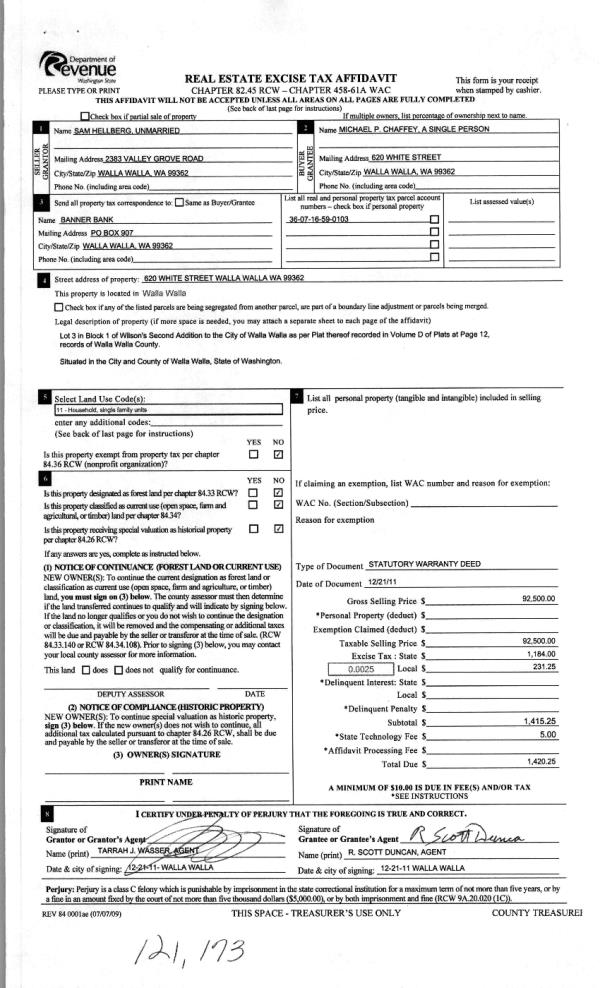 | 2 | 12/27/2011 | WARRANTY D | WARRANTY DEED | HELLBERG, SAM | CHAFFEY, MICHAEL P | | | $92,500.00 | 121173 | 2011-10171 |
