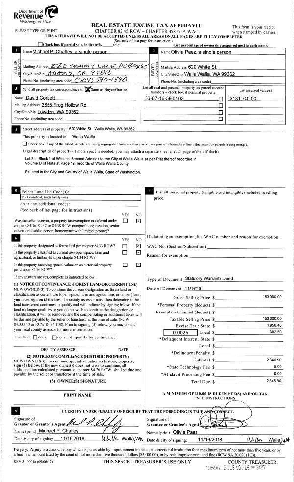 | 1 | 11/16/2018 | SWD | STATUTORY WARRANTY DEED | CHAFFEY MICHAEL P | PAEZ OLIVIA | | | $153,000.00 | 135961 | 2018-09549 |