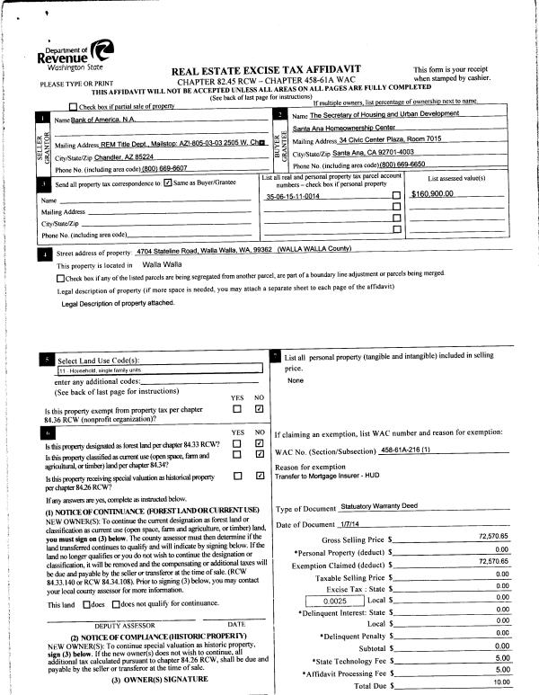 | 3 | 09/19/2013 | WARRANTY D | WARRANTY DEED | NORTHWEST TRUSTEE SERVICES INC | BANK OF AMERICA NA | | | $93,450.00 | 124682 | 2013-09611 |