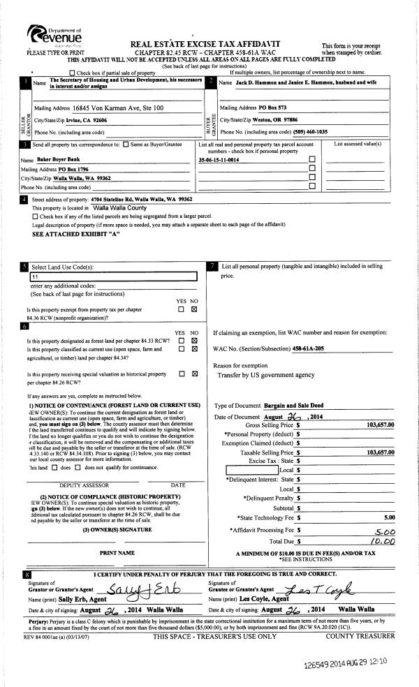 | 1 | 08/26/2014 | BARGAIN & | BARGAIN & SALE DEED | SECRETARY OF HOUSING & URBAN DEVELOPMENT | HAMMON JACK D & JANICE E | | | $103,657.00 | 126549 | 2014-06361 |