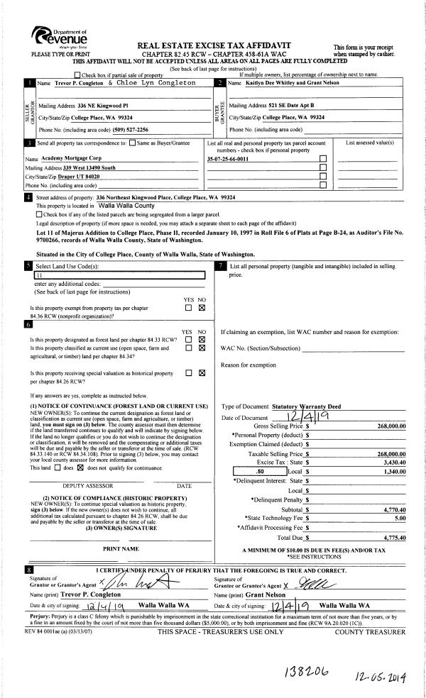| 1 | 12/05/2019 | SWD | STATUTORY WARRANTY DEED | CONGLETON TREVOR P | WHITLEY KAITLYN DEE & GRANT NELSON | | | $268,000.00 | 138206 | 2019-10084 |