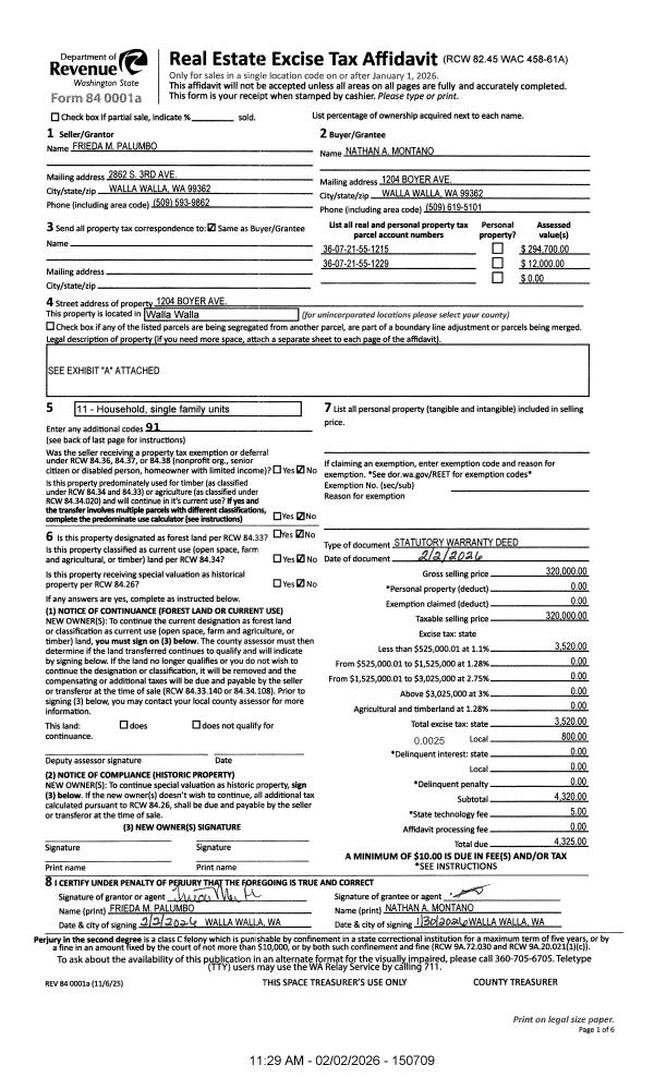 | 1 | 02/02/2026 | SWD | STATUTORY WARRANTY DEED | PALUMBO FREIDA M | MONTANO NATHAN A | | | $320,000.00 | 150709 | 2026-00601 |