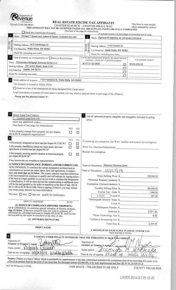 | 2 | 10/29/2014 | SWD | STATUTORY WARRANTY DEED | QUEEN RICHARD T & JOLENE M | NAPKORA ZIGMUND M | | | $155,000.00 | 126855 | 2014-07911 |