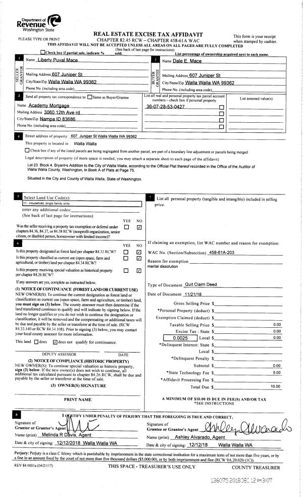 | 2 | 12/12/2018 | QCD | QUIT CLAIM DEED | MACE DALE E & LIBERTY P | MACE DALE E | | | $0.00 | 136075 | 2018-10267 |