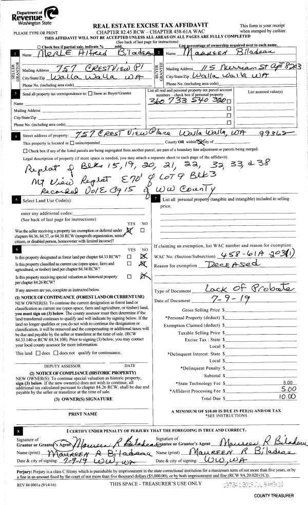 | 2 | 07/09/2019 | LOPA | LACK OF PROBATE AFFIDAVIT | BILADEAU MERLE ALFRED | BILADEAU MAUREEN RAE | | | $241,000.00 | 137241 | 2019-04892 |