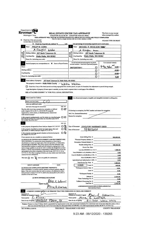 | 1 | 06/12/2020 | SWD | STATUTORY WARRANTY DEED | CORN PHILIP W | WOOLSON MICHAEL R | | | $180,000.00 | 139265 | 2020-05278 |