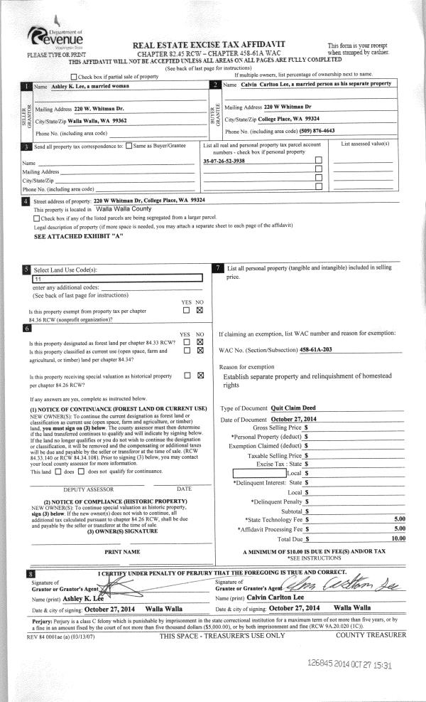 | 2 | 10/27/2014 | QCD | QUIT CLAIM DEED | LEE CALVIN CARLTON | | | | | 126845 | 2014-07861 |