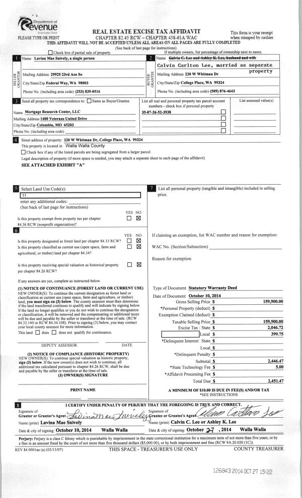 | 3 | 11/03/2014 | WARRANTY D | WARRANTY DEED | SNIVELY LAVINA MAE | LEE CALVIN CARLTON | | | $159,900.00 | 126843 | 2014-07860 |