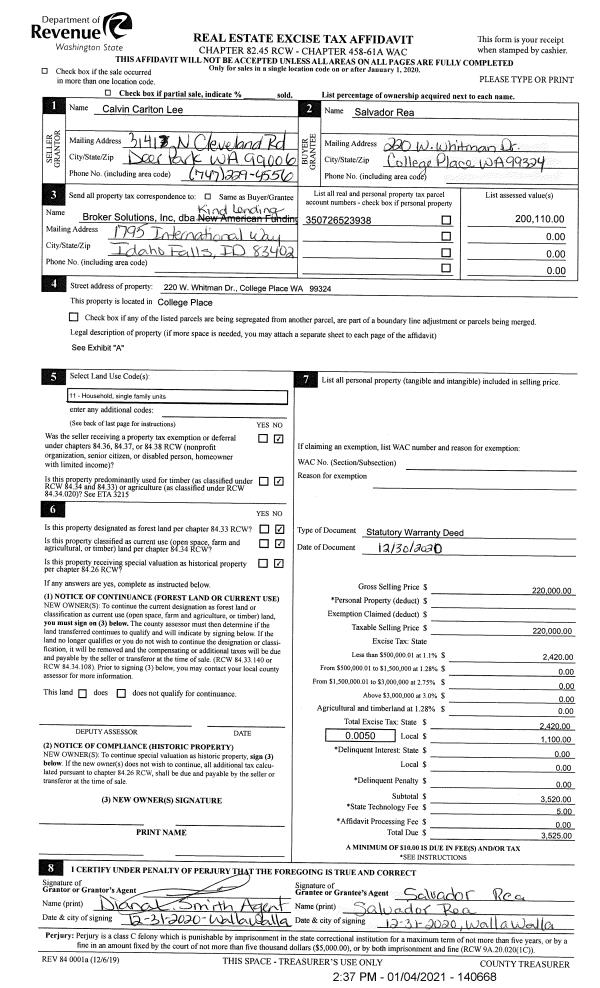 | 1 | 01/04/2021 | SWD | STATUTORY WARRANTY DEED | LEE CALVIN CARLTON | REA SALVADOR | | | $220,000.00 | 140668 | 2021-00075 |