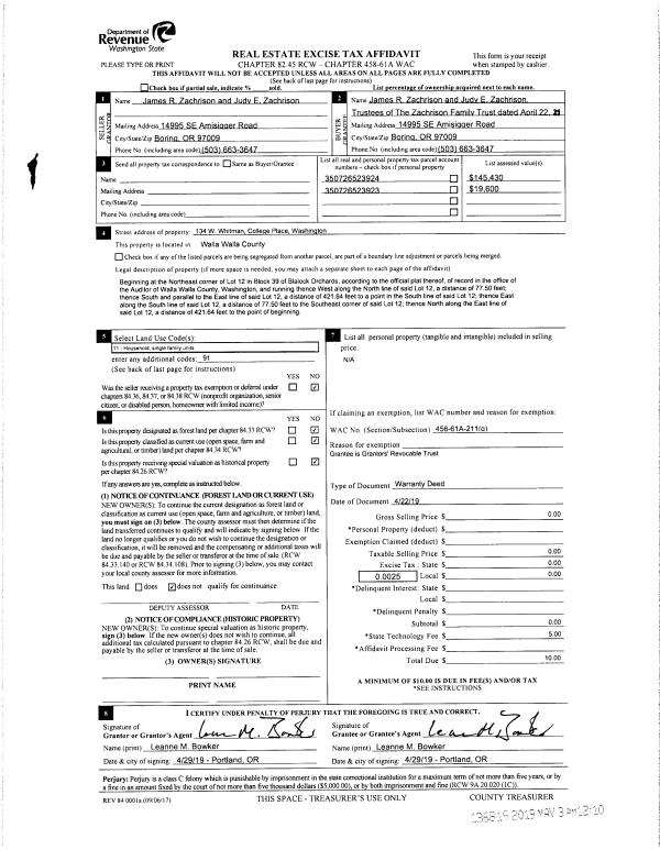 | 4 | 04/22/2019 | WARRANTY D | WARRANTY DEED | ZACHRISON JAMES R & JUDY E | ZACHRISON FAMILY TRUST | 2 PARCELS | | $0.00 | 136819 | 2019-02921 |