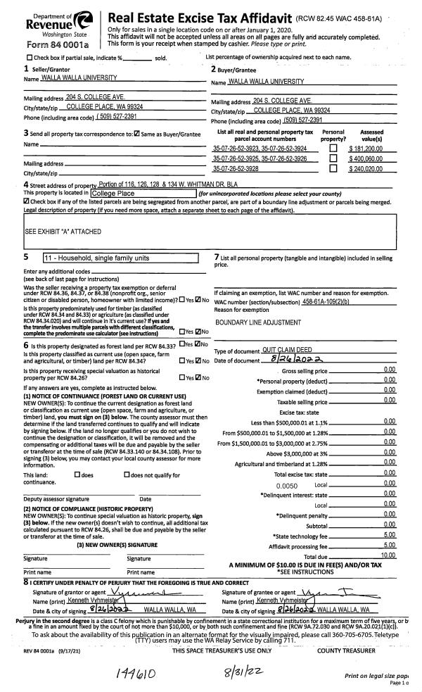 | 2 | 08/31/2022 | SWD | STATUTORY WARRANTY DEED | ZACHRISON FAMILY TRUST | WALLA WALLA UNIVERSITY | | | | 144608 | 2022-07331 |