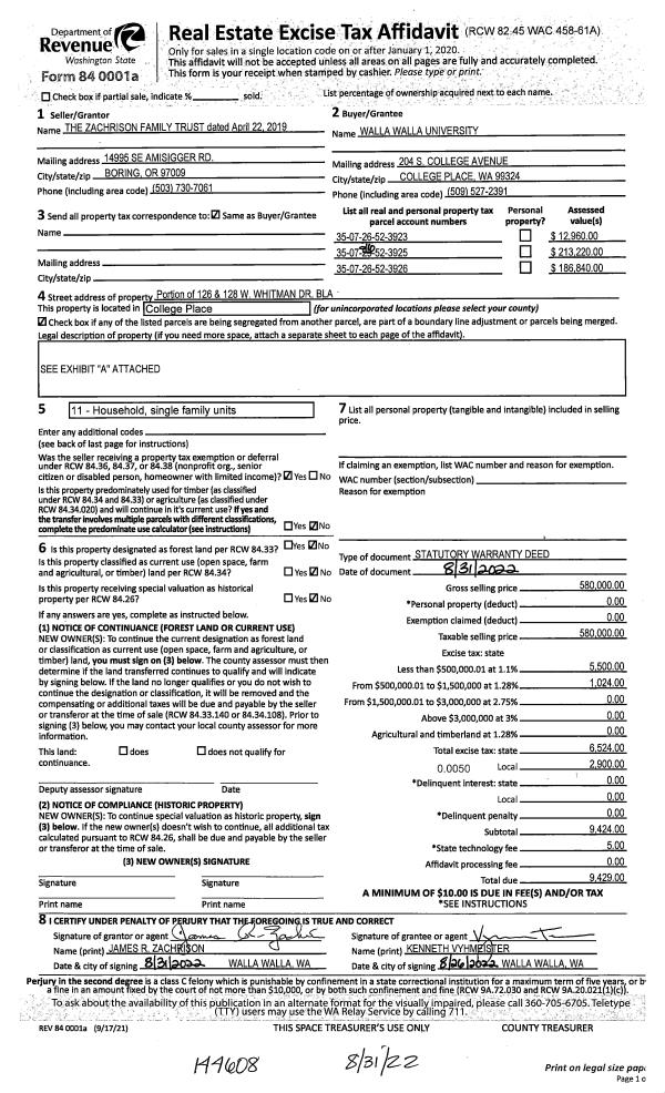 | 2 | 08/31/2022 | SWD | STATUTORY WARRANTY DEED | ZACHRISON FAMILY TRUST | WALLA WALLA UNIVERSITY | | | | 144608 | 2022-07331 |