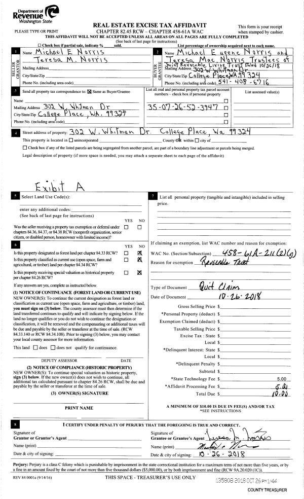 | 1 | 10/26/2018 | QCD | QUIT CLAIM DEED | NORRIS MICHAEL E TERESA M | JOINT REVOCABLE LIVING TRUST DATED 10/26/18 | | | $0.00 | 135808 | 2018-08871 |