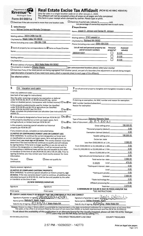 | 1 | 10/29/2021 | SWD | STATUTORY WARRANTY DEED | SMIRES MICHAEL | JOHNSON JOSEPH D & DENISE W | | | $190,000.00 | 142773 | 2021-13075 |