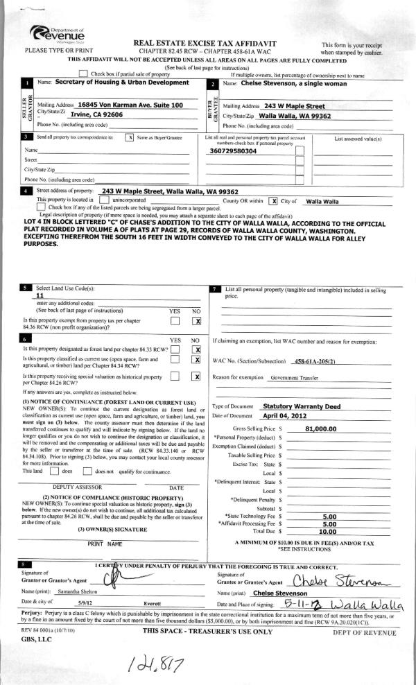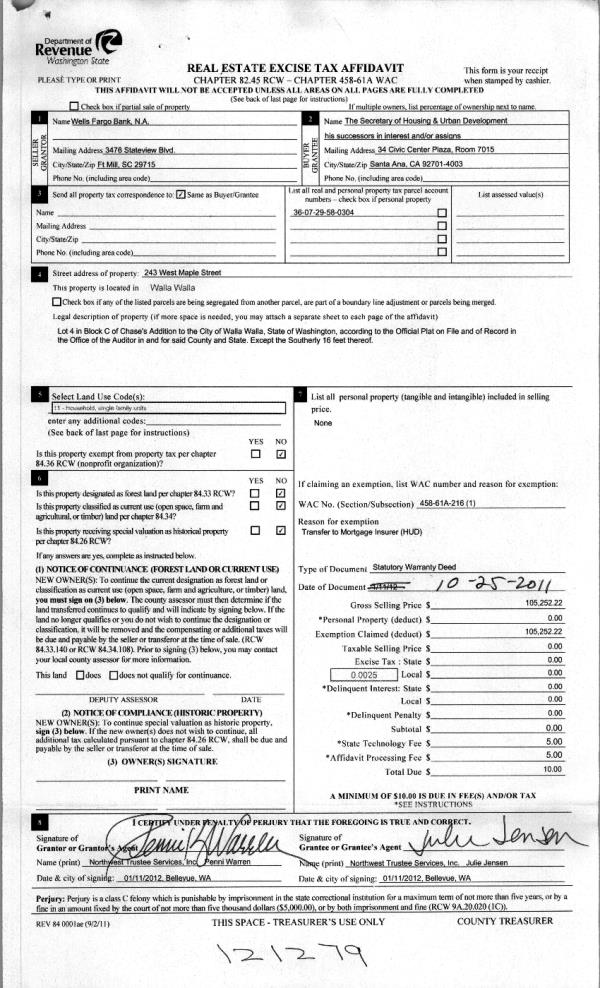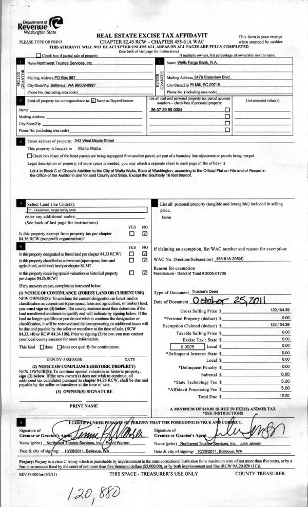 | 5 | 10/27/2011 | WARRANTY D | WARRANTY DEED | NORTHWEST TRUSTEE SERVICES INC | WELLS FARGO BANK NA | | | $122,104.00 | 120880 | 2011-08386 |
