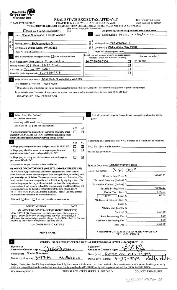 | 2 | 03/28/2019 | SWD | STATUTORY WARRANTY DEED | STEVENSON CHELSE | PETRI ROSEMARIE | | | $165,000.00 | 136574 | 2019-01947 |