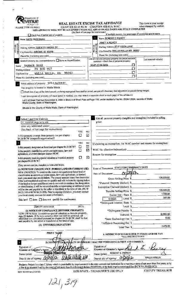 | 3 | 01/23/2012 | WARRANTY D | WARRANTY DEED | DREESMANN, NATE | PIERCY, ROBERT E & JANET A | | | $135,000.00 | 121319 | 2012-00645 |