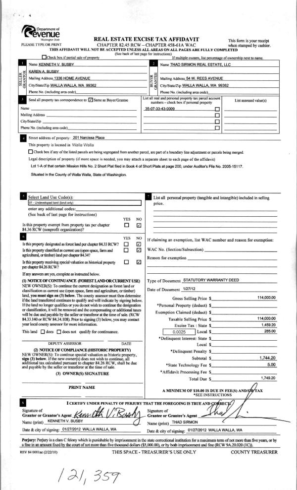 | 4 | 02/02/2012 | WARRANTY D | WARRANTY DEED | BUSBY, KENNETH & KAREN A | THAD SIRMON REAL ESTATE LLC | | | $114,000.00 | 121359 | 2012-00957 |