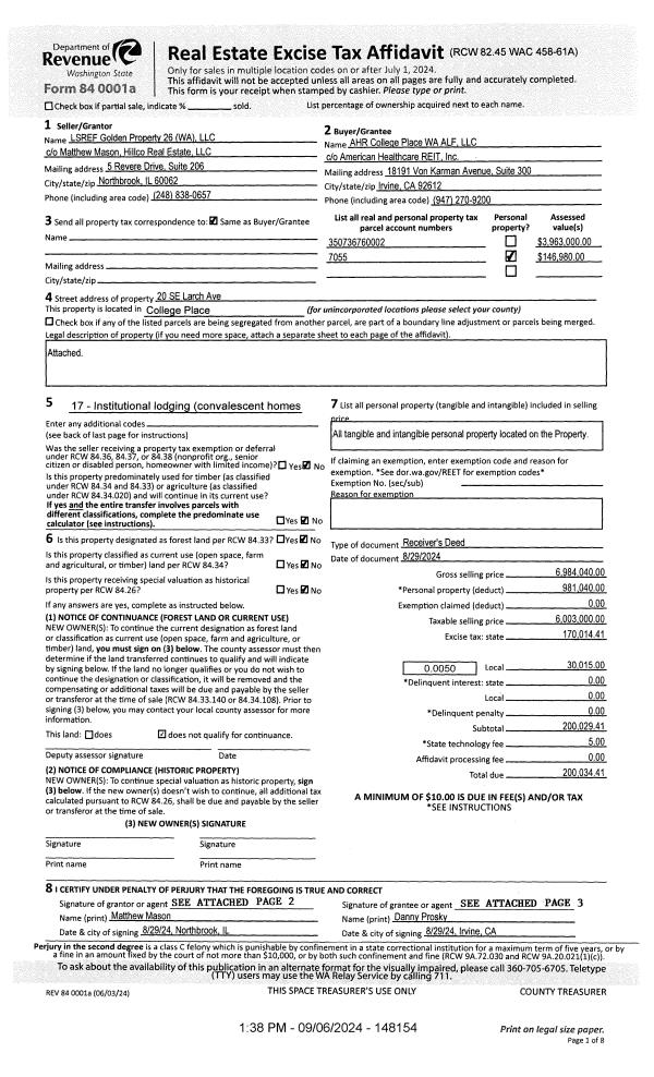 | 1 | 09/06/2024 | RECEIVER'S | RECEIVER'S DEED | LSREF GOLDEN PROPERTY 26 (WA) LLC | AHR COLLEGE PLACE WA ALF LLC | | | $6,003,000.00 | 148154 | 2024-05071 |