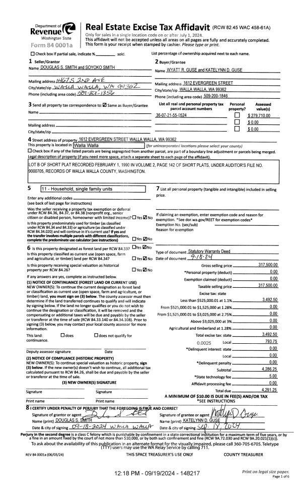 | 1 | 09/19/2024 | SWD | STATUTORY WARRANTY DEED | SMITH DOUGLAS S & SOYOKO | GUSE WYATT R & KATELYNN D | | | $317,500.00 | 148217 | 2024-05361 |