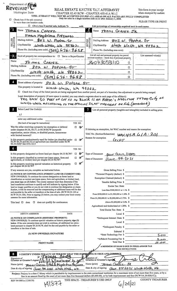 | 1 | 06/09/2021 | QCD | QUIT CLAIM DEED | CORTEZ TOMAS | CORTEZ TOMAS JR | | | $0.00 | 141877 | 2021-07690 |