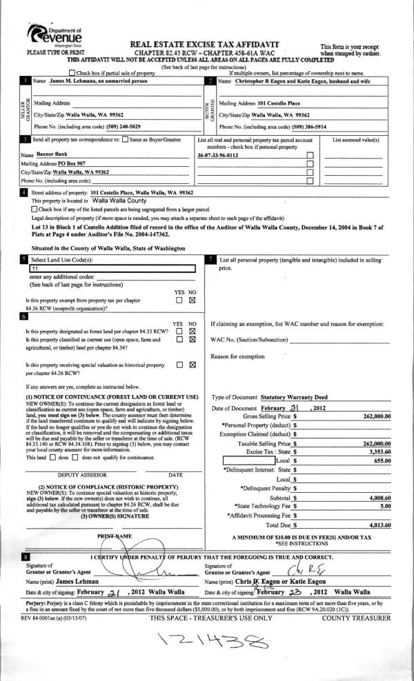| 2 | 02/24/2012 | WARRANTY D | WARRANTY DEED | LEHMANN, JAMES M | EAGON, CHRISTOPHER R & KATIE | | | $262,000.00 | 121438 | 2012-01581 |