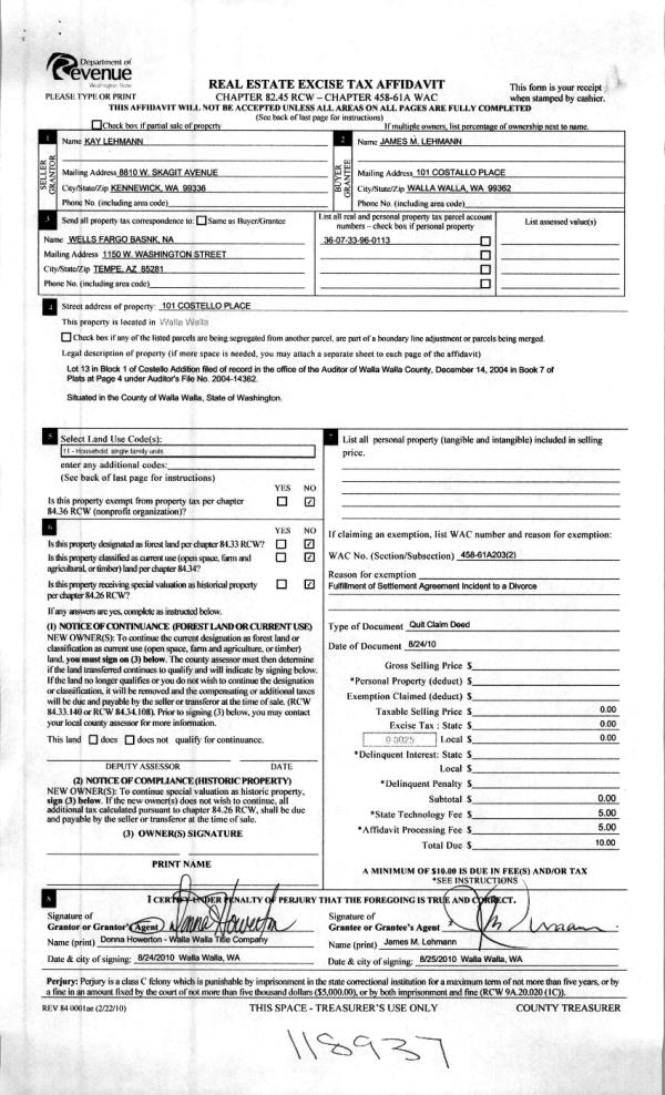 | 3 | 08/30/2010 | QCD | QUIT CLAIM DEED | LEHMANN, KAY | LEHMANN, JAMES M | | | | 118937 | 2010-06683 |