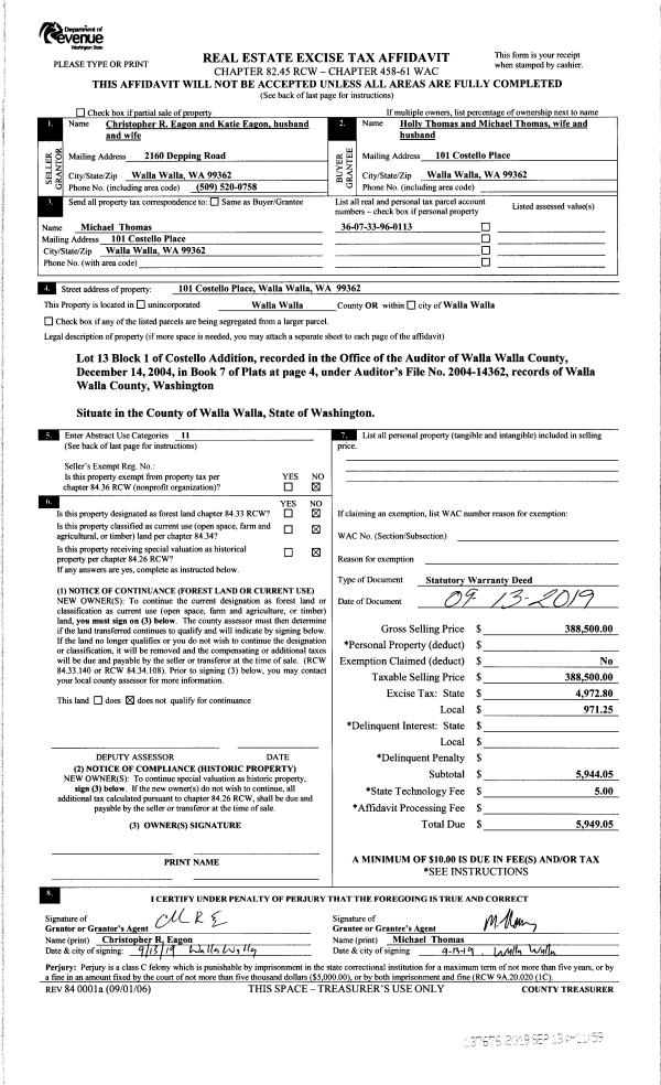 | 1 | 09/13/2019 | SWD | STATUTORY WARRANTY DEED | EAGON CHRISTOPHER R & KATIE | THOMAS MICHAEL & HOLLY | | | $388,500.00 | 137676 | 2019-07137 |