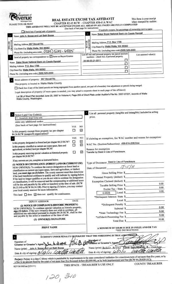 | 4 | 06/27/2011 | WARRANTY D | WARRANTY DEED | BOOSE, JOHN ALBERT & LORI BETH | BAKER BOYER NATIONAL BANK | | | | 120310 | 2011-04940 |