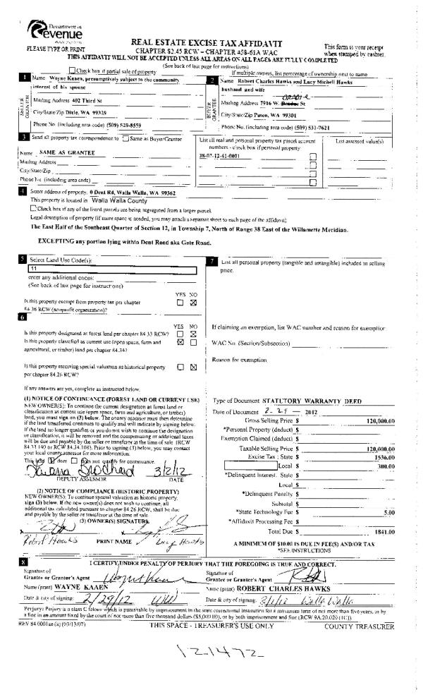 | 1 | 03/02/2012 | WARRANTY D | WARRANTY DEED | KAAEN, WAYNE H | HAWKS, ROBERT CHARLES & LUCY M | | | $120,000.00 | 121472 | 2012-01775 |