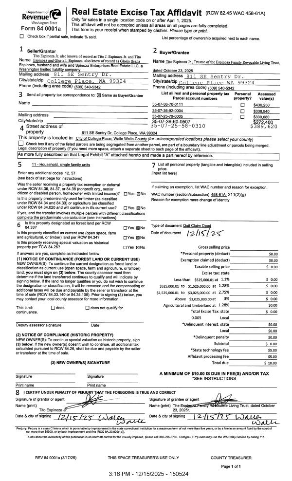 | 1 | 12/15/2025 | QCD | QUIT CLAIM DEED | SPINOZA ENTERPRISES REAL ESTATE LLC | ESPINOZA FAMILY REVOCABLE LIVING TRUST | | | | 150524 | 2025-07692 |