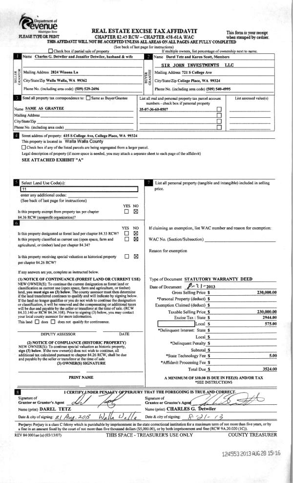 | 4 | 08/28/2013 | WARRANTY D | WARRANTY DEED | DETWILER, CHARLES G & JENNIFER | SIR JOHN INVESTMENTS LLC | | | $230,000.00 | 124553 | 2013-08886 |
